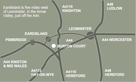 From Leominster (4 miles) : Follow the signs to Rhayader (A44). At traffic lights proceed up the hill and go straight on at roundabout keeping Morrisons supermarket on your left. After a few hundred yards the road Y forks take a left here and stay on the A44 for 4 miles and you will see the signposts for Burton Court.